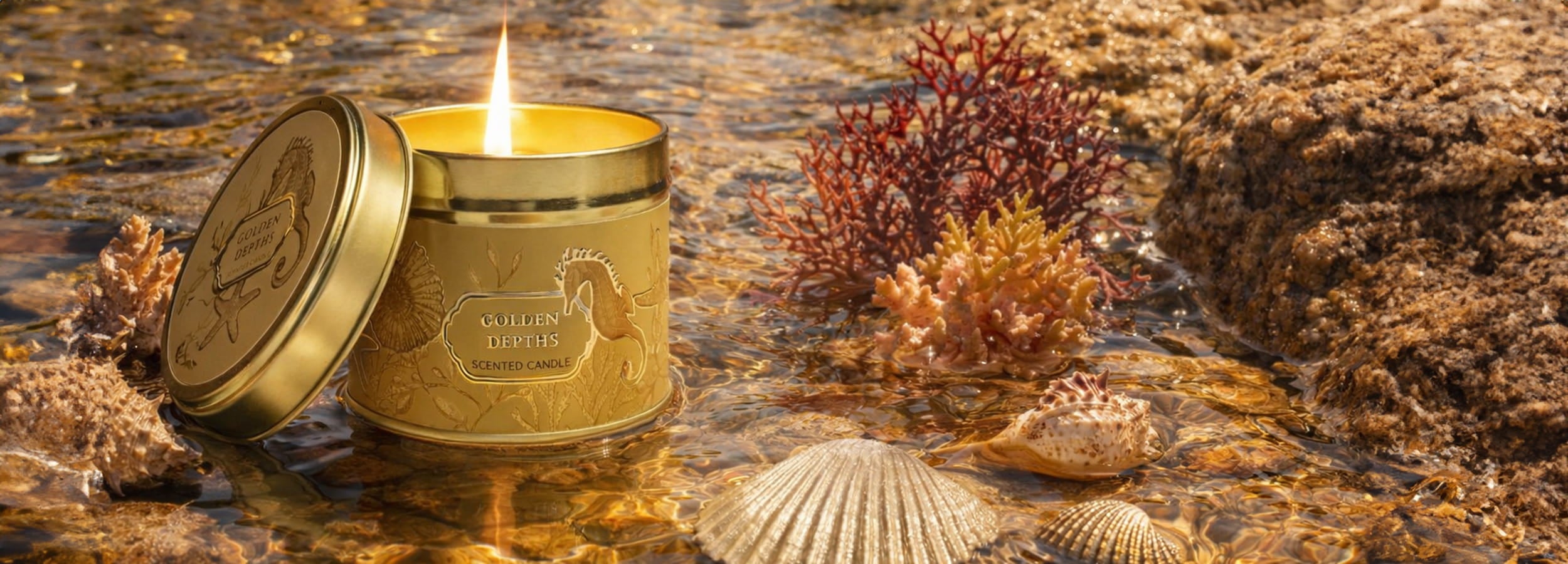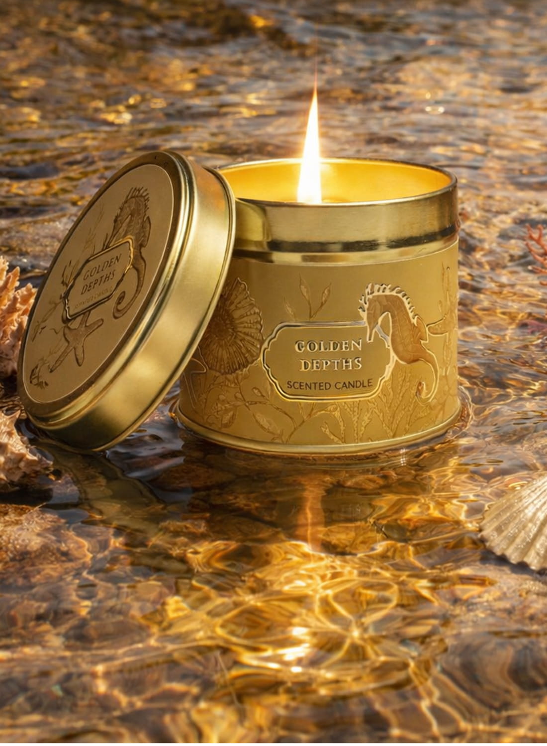 Introducing our Golden Depths Candle - a beautifully packaged, ocean-inspired gift designed to bring the warmth of a sunlit coastal day to every moment you light it.