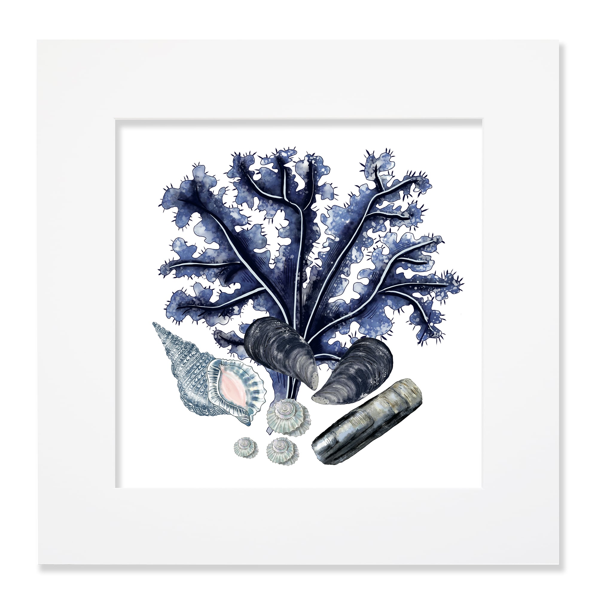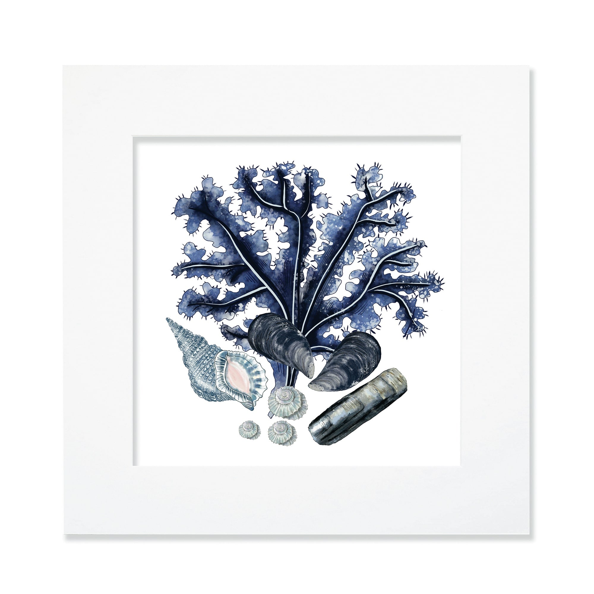 30cm square mounted coastal print featuring deep blue coral, mussels, seashells, and pebbles in a white mount, evoking a serene ocean-inspired aesthetic.